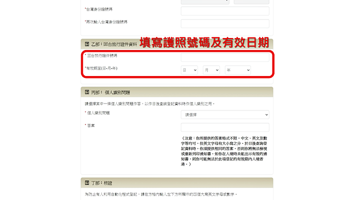 這個欄位比較特別一點,上面標題是寫要填寫【回台旅行證件資料】,大眾一點的說法就是填寫台灣的護照號碼跟有效日期。