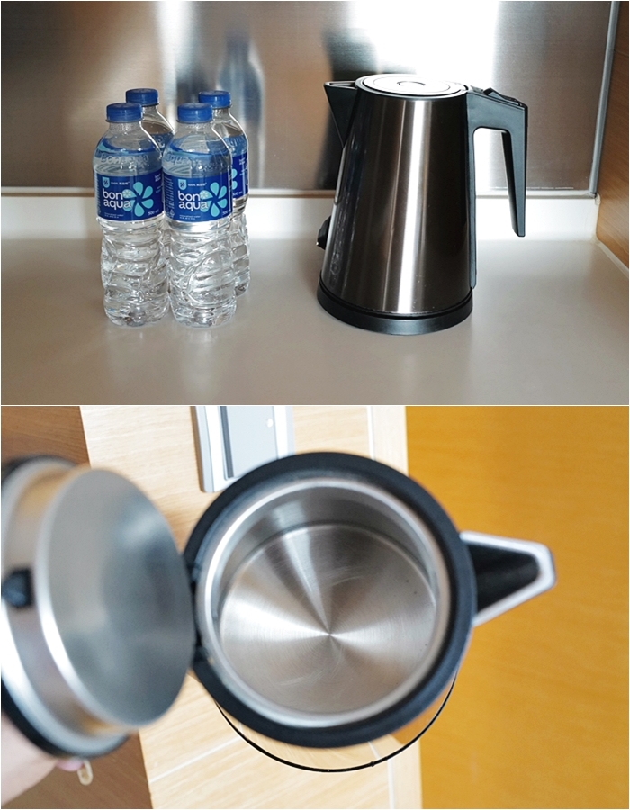 | 熱水壺洗得很乾淨,我住飯店都會先看一下熱水壺有沒有洗乾淨這種小細節,礦泉水不夠可以打電話給櫃檯請他們送。 |