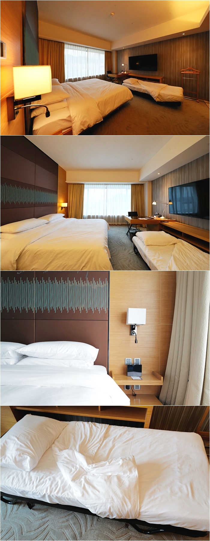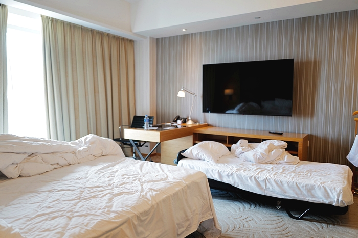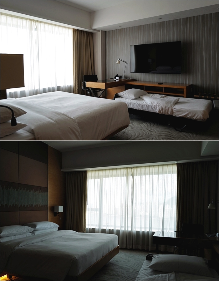 | 推開隔間木門來到房間,我們有加一張單人床,這單人床不是我就是我女兒睡,房間空間也滿大的,我很喜歡沙田凱悅酒店的採光,窗簾有兩層,全遮蔽的話遮光性極佳。 |