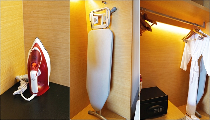 | 衣櫥內提供保險箱跟浴袍、特別的是還有燙衣板根熨斗,仔細想想好像是香港的酒店會特別準備這些給客人,非常貼心,尤其長途旅行女生的衣物很容易塞到皺皺的,有熨斗跟燙衣板很讚。 |