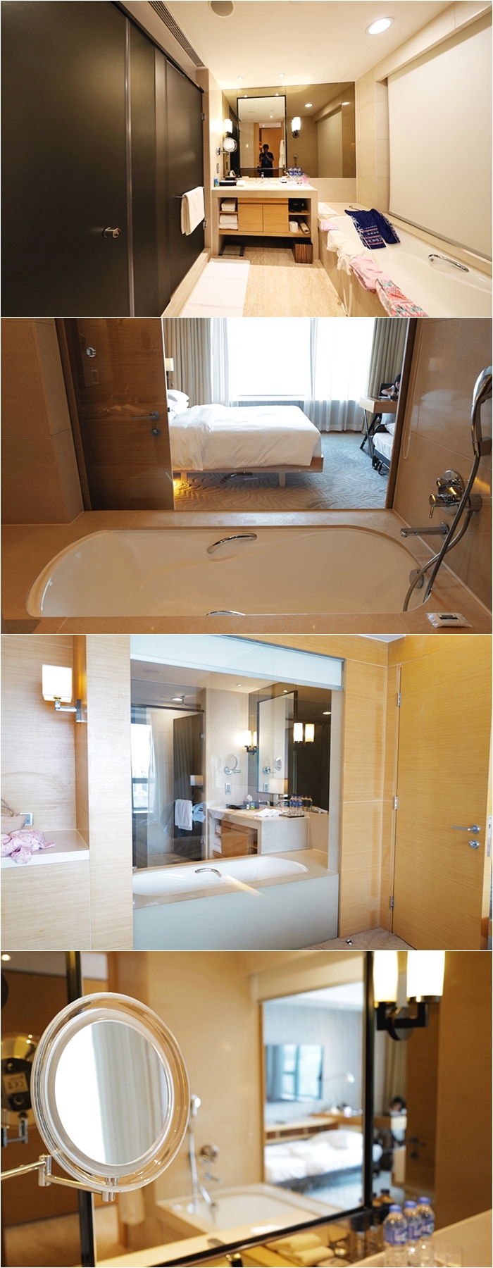 | 衛浴空間是乾濕分離,浴缸跟房間是透明玻璃,如果害羞的話有電動簾可以放下,洗倏台是單人盆。 |