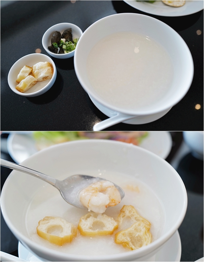 | 蝦球粥老婆非常喜歡,香港的白粥敖的水分較多,搭配沙拉小菜讓老婆很滿足,他本身就是愛喝粥的人,正合她意。 |