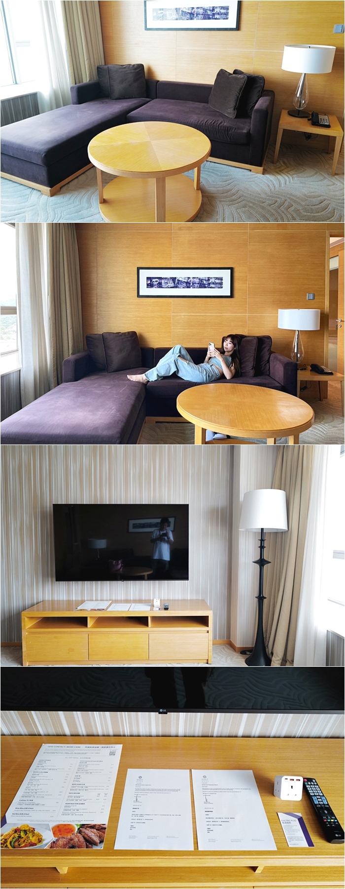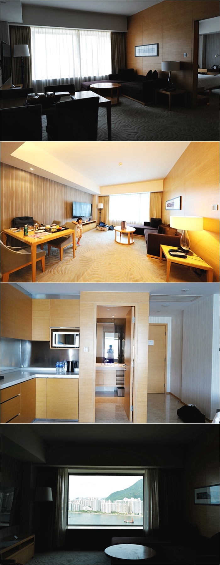 | 一打開房間門讓我滿驚訝的,雖然我們一開始就知道是套房,但是這客廳的空間也太大了,其中一個角落還有小廚房,獨立的客廳廁所加上長桌用餐桌椅,且大面積落地窗的採光相當棒,窗外的景觀就是港灣的風景,一整個讓人心曠神怡,這樣的房間隊我們來說很適合,因為很久沒來香港了,很多香港朋友紛紛要來酒店找我們,這客廳就可以大聊小酌了。 |