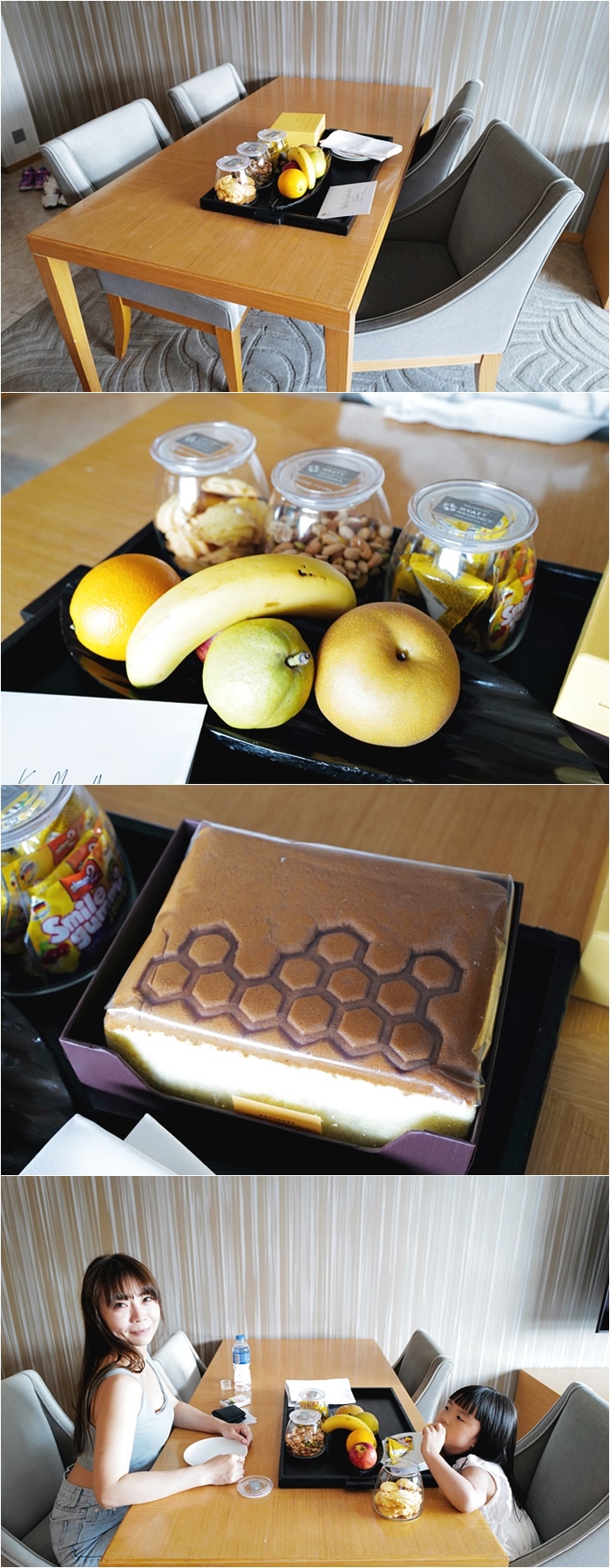 | 長桌上有準備水果跟零食給客人,且零食給的超大方,三冠分別是滿滿的手工餅乾、堅果、MM巧克力,光是超大罐的堅果就很貴的,水果的種類也滿多的,另外還有凱悅酒店非常有名的蜂蜜蛋糕。 |