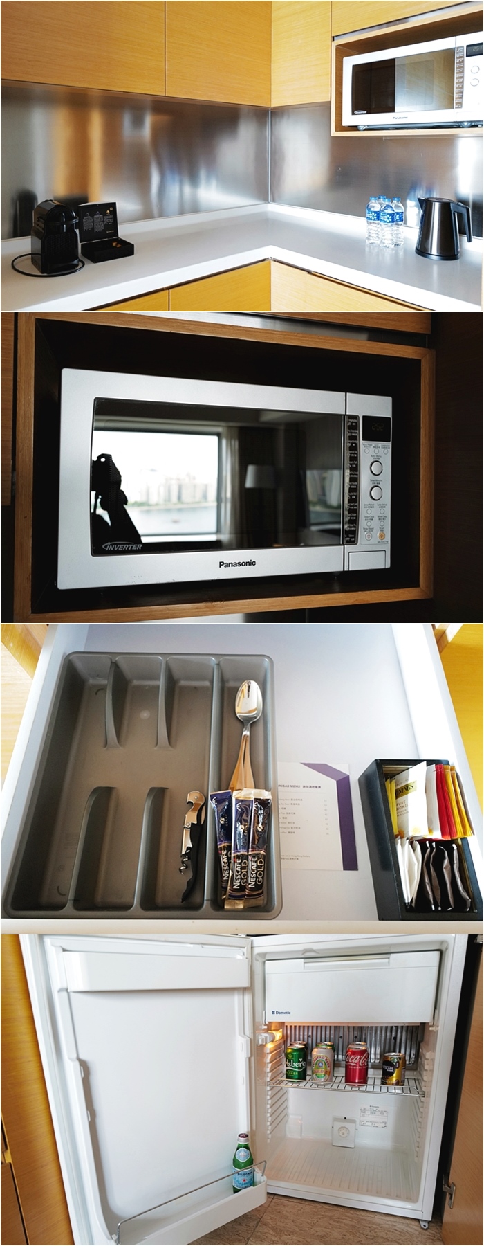 | 小廚房最重要的是有一台微波爐,對於有小孩子的家庭來說,微波爐非常重要,因為小孩子度子餓的時間點都滿莫名其妙的,有台微波爐隨時可以加熱餐點給小孩吃,搭配一台全自動膠囊咖啡,冰箱則是在下方櫃內,裡面有飲料,記得冰箱飲料可以先詢問櫃檯是否另外付費。 |