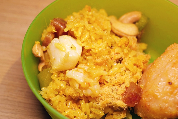 | 晚上的是炒飯配上肉鬆,且晚上我仔細看才發現裡面竟然還有干貝跟腰果等食材拌在裡面,非常豐富呢!! |