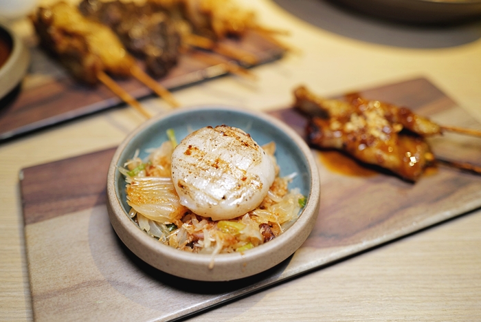 | 北海道生食級干貝稍微炙燒過後就裝缽上桌,看起來也太可口了,干貝上刷了淡淡的提出不一樣的風味,入口軟嫩多汁的滋味讓人沉醉,夾著底下的配菜一起吃讓整體的層次多了許多變化。 |