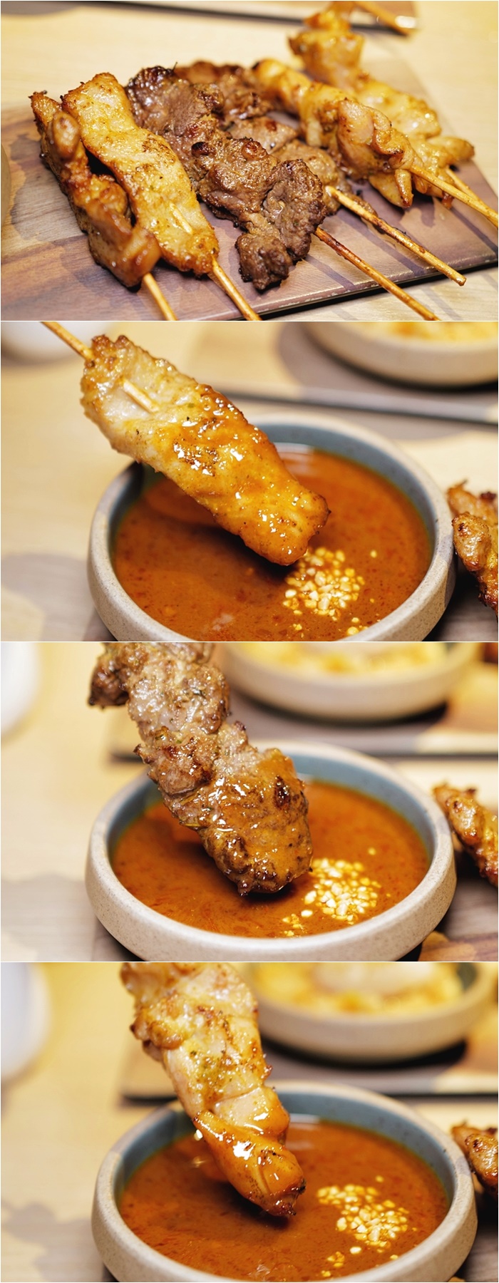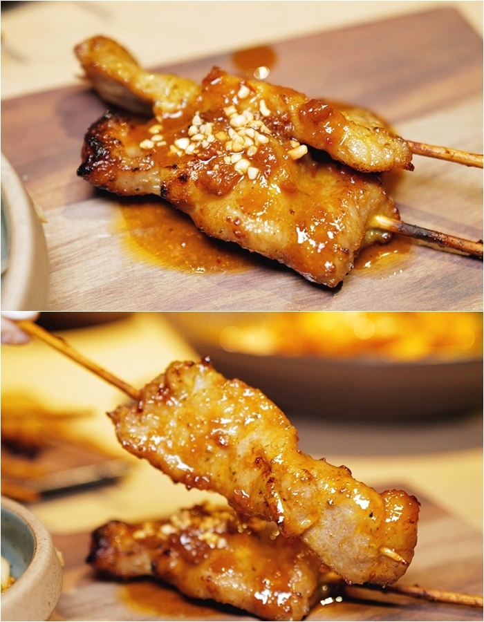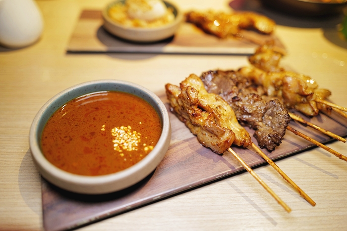 | 串烤候的豬肉串已經刷上沙嗲醬,豬肉挑選的是五花肉,吃起來帶點油脂,肥瘦的比較剛剛好,搭配沙嗲醬入口一整個就東南亞風情就浮現出來了,真的很好吃,馬上轉頭拿起菜單又點了一份綜合沙嗲串燒。 |