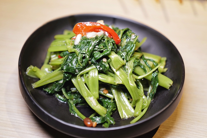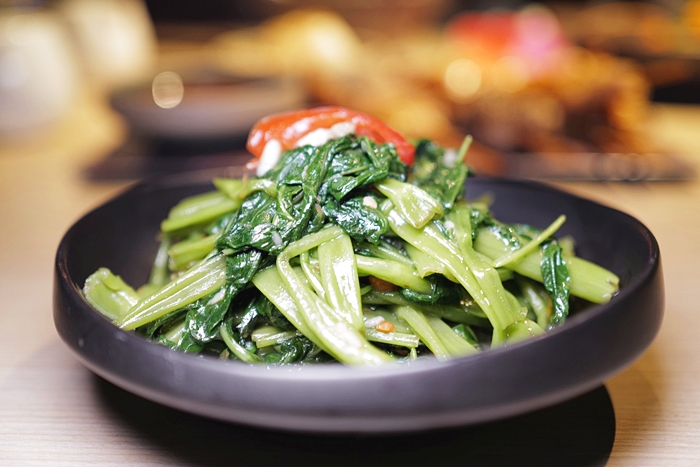 | 泰式炒通菜的蝦醬味道比較淡,好像只有台灣的蝦醬空心菜才會吵的味道很重,這邊吃起來還可以吃到空心菜的菜心脆度,葉菜的部分很香。 |