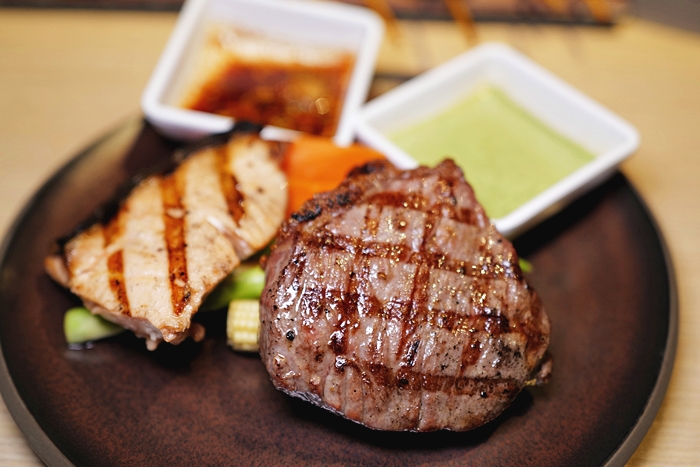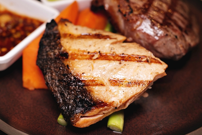 | 雙主菜的另一份是鮭魚,鮭魚也烤得很好,熟度也恰恰好,不會過熟又保持了鮭魚的水嫩感,魚皮乾焦的很好吃,魚肉散發淡雅的炭味,一口咬下還會吃到鮭魚的肉汁,也超完美的烤鮭魚! |