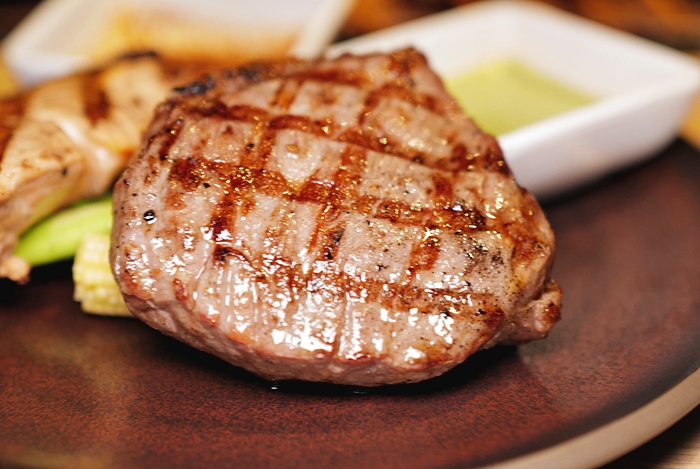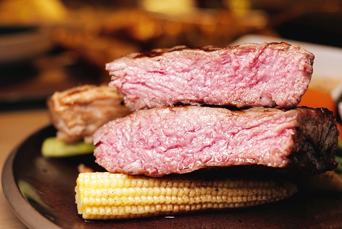| 看看切開後這熟度是不是很讚,這完全是我最愛的熟度,切開後見紅不見血的五分熟,能控制到五分成這樣的完美熟度真的不容易,等不及切下一塊牛排送入嘴哩,確實是軟嫩揪C,不沾醬就覺得吃好吃,超軟嫩,而且整塊都沒有咬到筋,超滿意!!! |