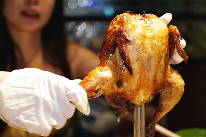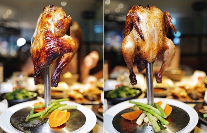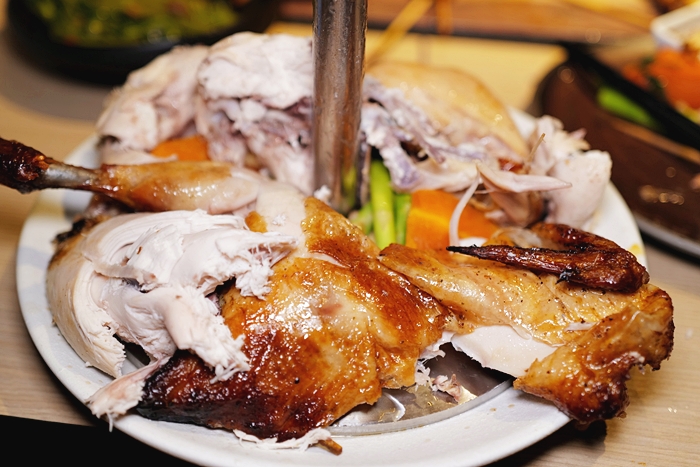 | 菜單上看到這泰式燒雞就覺得很有趣,台灣烤雞、甕仔雞、磚窯雞已經是無敵的存在了,泰式燒雞到底是什麼味道,就是想試試看,送上來的吸睛度確實是不錯的,體型大小看起來像是春雞,端上來的時候味道確實非常香。 |