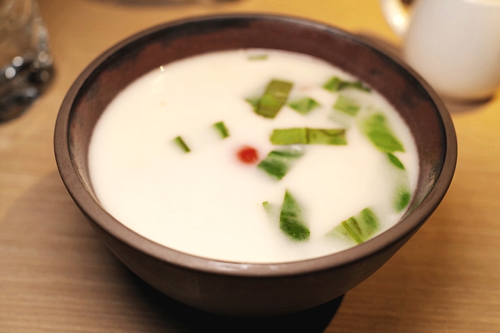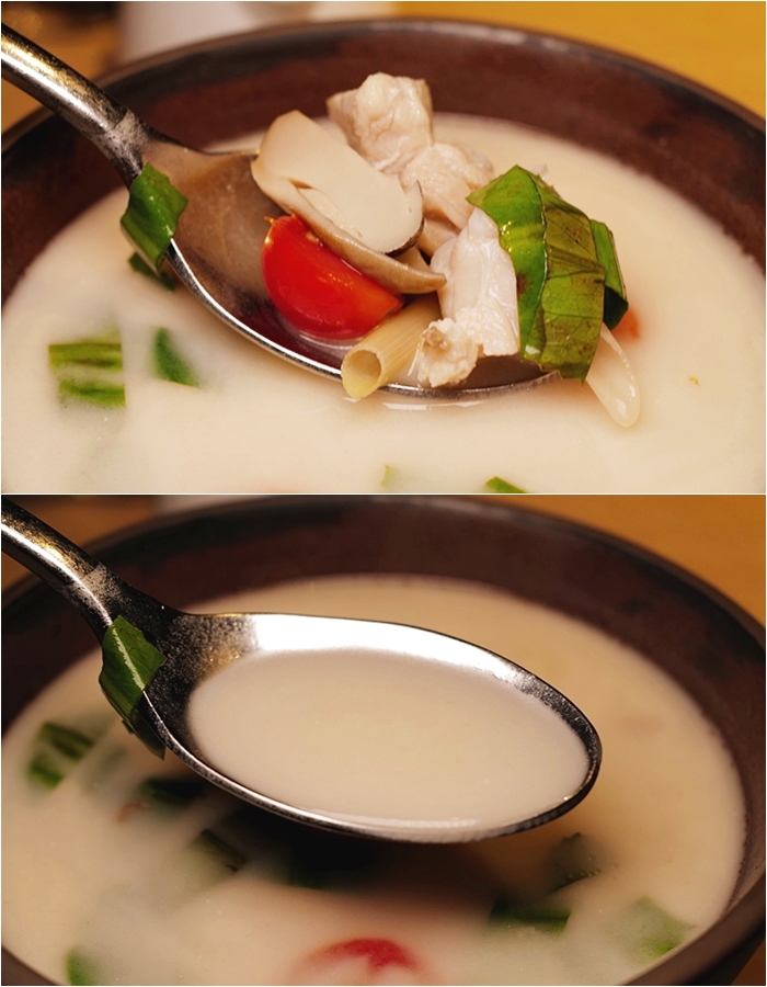 | 喝下一口雞湯有點驚艷,味道相當的好,跟泰國喝到的一模一樣非常道地,但是湯頭的醇厚感多了許多,豐富的香料在口裡綻放開來,非常滿意的香茅椰汁雞湯。 |