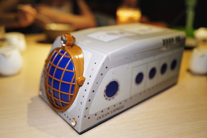 | 跟中午吃海龍王水族餐廳一樣點了一份兒童餐給女兒,同樣是用海洋公園內最有名的海洋列車造型餐盒裝盛,不知道是中午跟晚上的差別還是每家餐廳的兒童餐配菜略有不同,晚上的飯就不太一樣,不知道是不是我中午沒有仔細看。 |