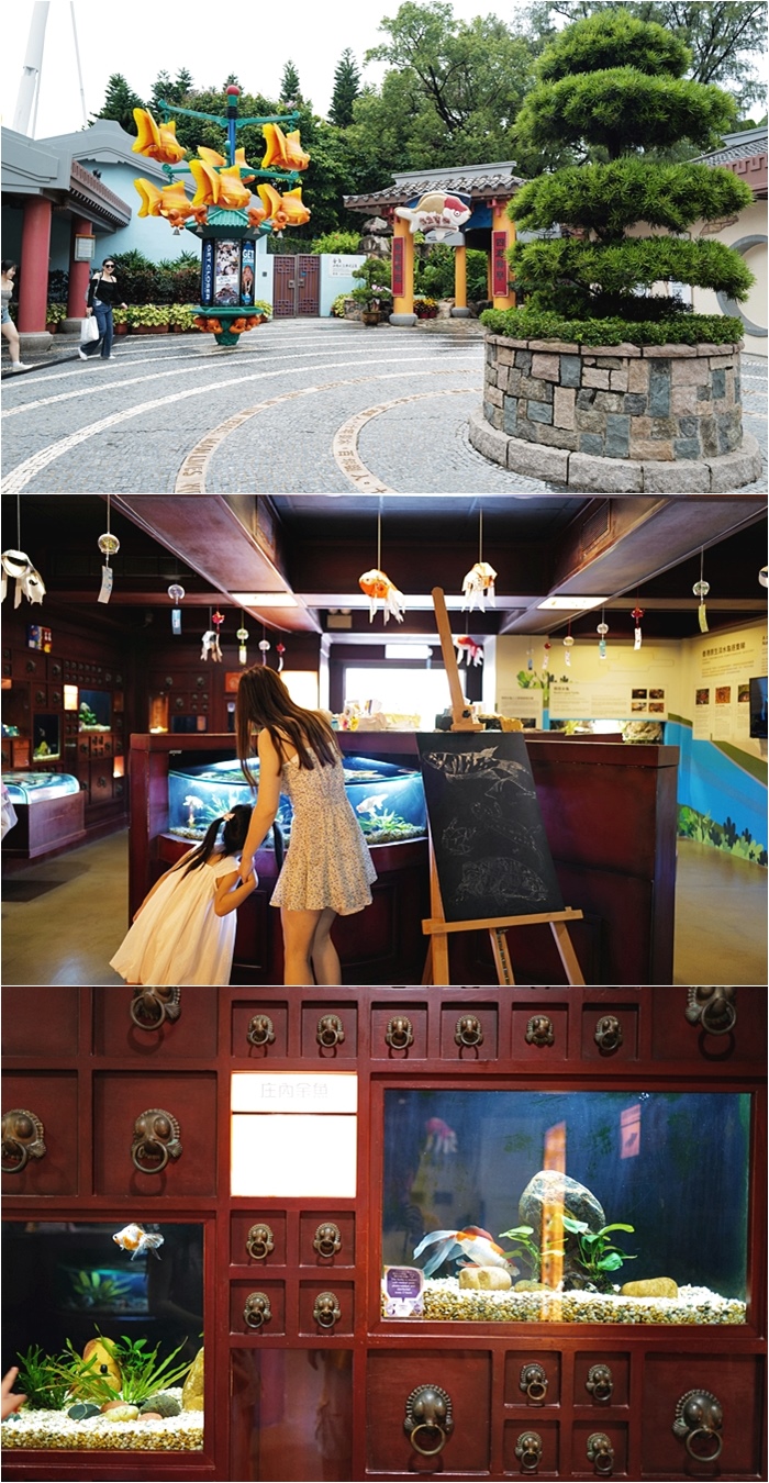 | 熊貓館出口旁推薦來到金魚區,這一區我還滿喜歡的,主要都是中式風格為主,用中式家具跟櫥櫃設計成一格一格的金魚缸真的好特別又好看,很有特色的淡水金魚館。 |