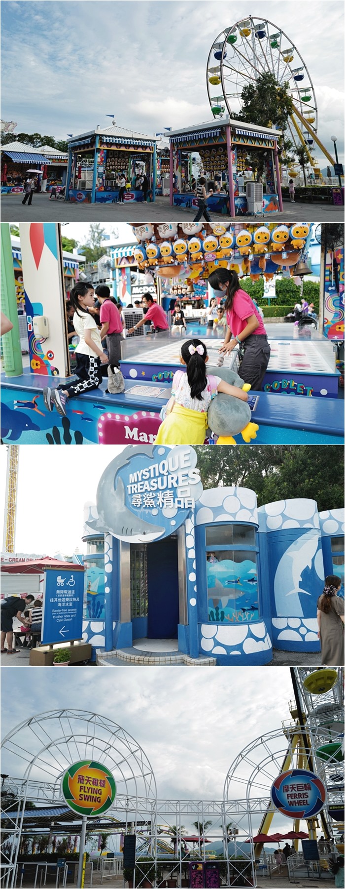 | 往下走就會到達海洋天地最主要的遊樂區域,這邊也有一坐雲霄飛車跟海盜船以及一個巨型海邊摩天輪,香港海洋公園的設計我還滿喜歡的,每一個區域都有不同的遊具跟水族主題館。 |