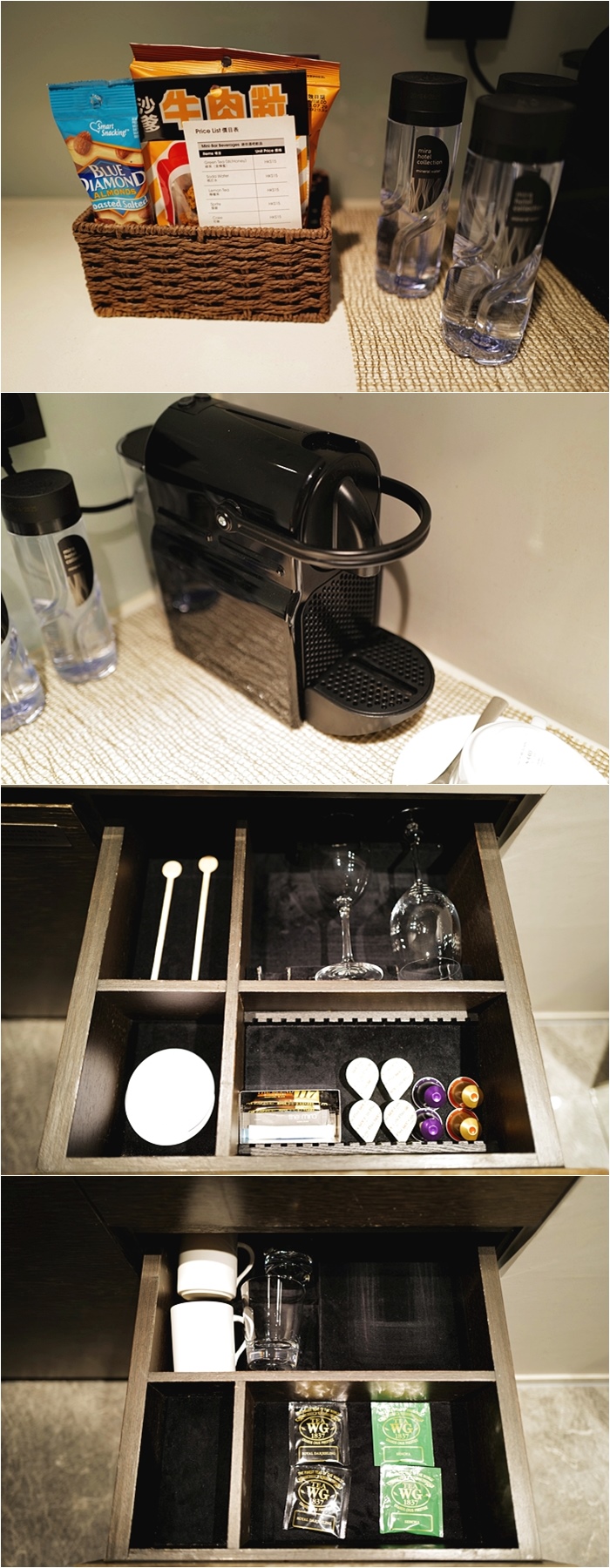| 客廳旁還有一個小調理台,調理台上的零食餅乾是需要付費的,酒店也貼心地放上價目表讓客人知道費用再自己決定要不要取用,另外還有一台膠囊咖啡機,膠囊咖啡跟杯盤組都在抽屜哩,咖啡是不用付費的,對於早上起來都想喝一杯咖啡的太妃來說,膠囊咖啡真的很實用,另外也有提供茶包。 |