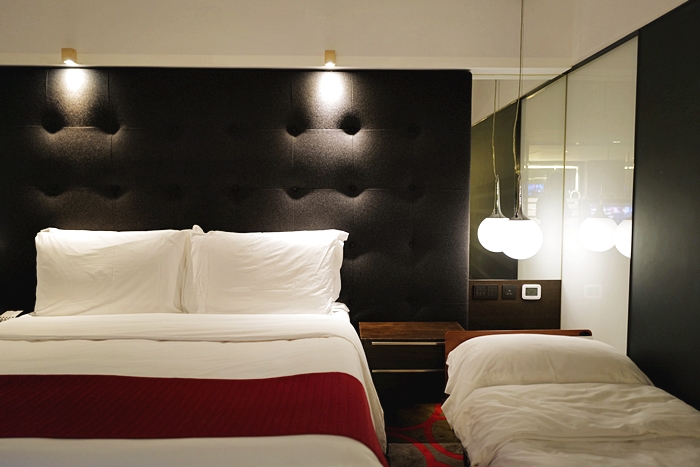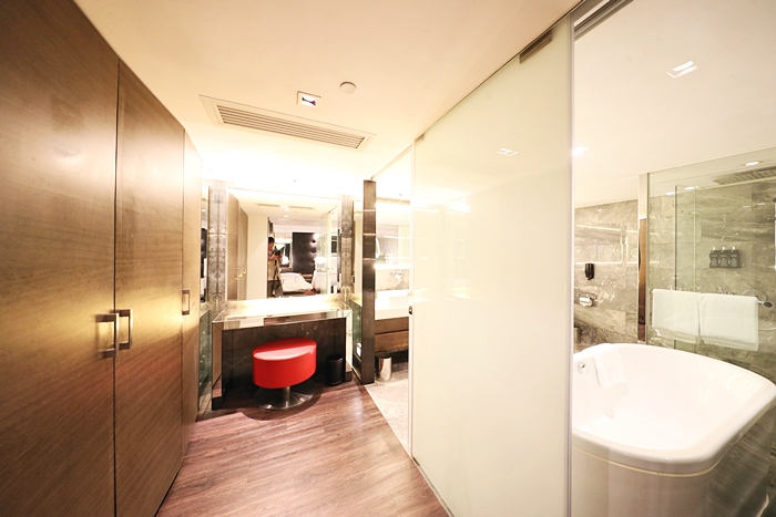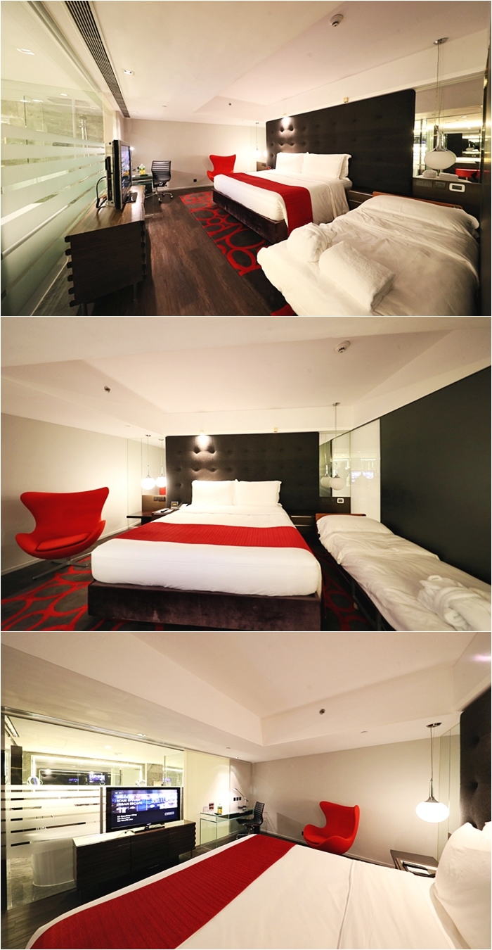 | 推開客廳的房門就可以進入到房間,房間也很有氣氛,同樣的紅黑地毯貴氣奢華感十足,搭配紅色單人沙發椅超有時尚感,房間的空間也滿大的,重底是空調超給力,香港的夏天真的非常悶熱,每次回到房間都覺得又活了過來,有提供加床服務。 |