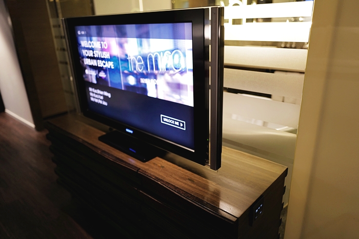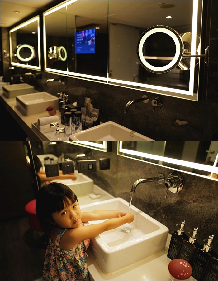 | 鏡子上還有一個小電視銀幕,旁邊還有小椅子剛好可以讓小朋友站上去開水龍頭,洗手台的檯面也超大,老婆放置她的保養用品跟隱形眼鏡盒、藥水都很好放置。 |