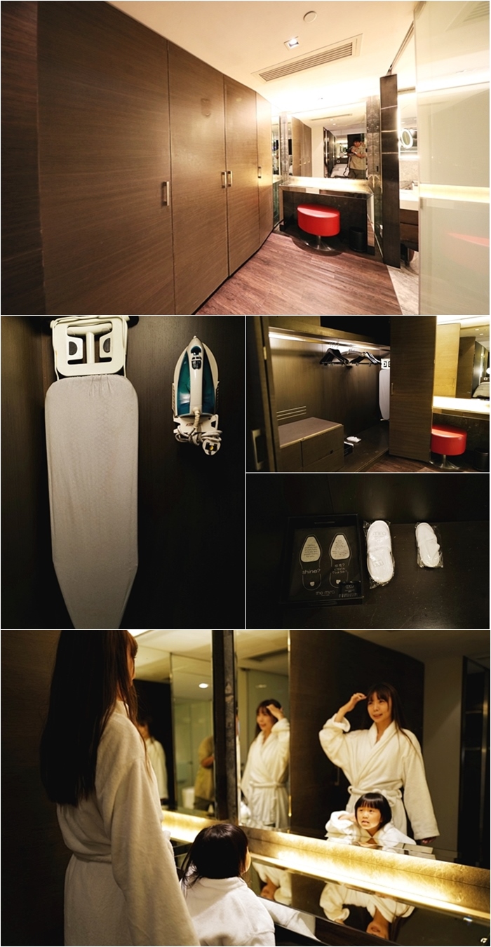 | 一整面的衣物櫃跟行李架,對於女生來說超級貼心又方便,且都有提供熨斗跟燙衣板,我發現好像香港的飯店都會提供熨斗跟燙衣板,對於亞洲其他地方的酒店好像很少見到,還有女生最需要的化妝台,超大鏡子獲得母女倆的讚賞。 |