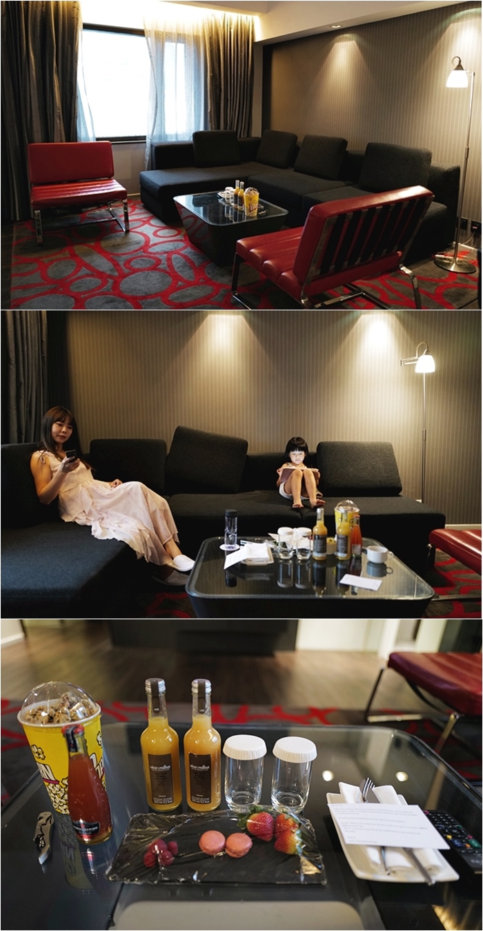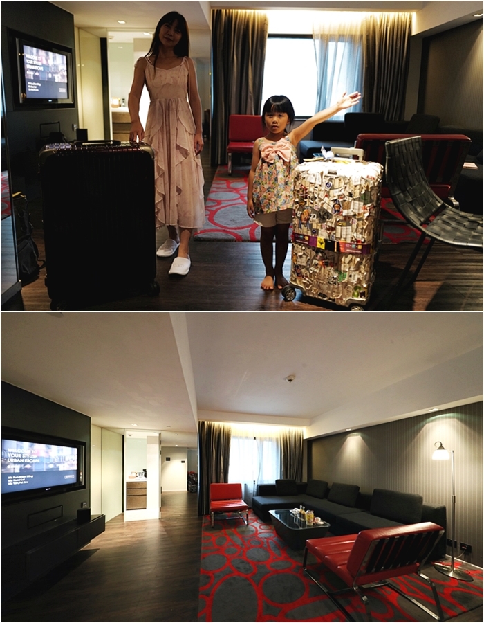 | 我們這次入住美麗華是屬於一房一廳的家庭套房,推開門看到的客廳我們也很喜歡,客廳非常大,地毯紅黑配色相當有貴族風,長型沙發還有紅色單人座沙發看起來都相當大氣。 |