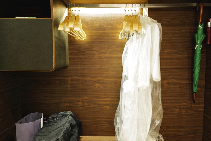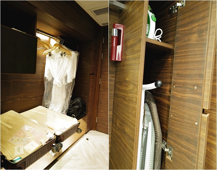 | 打開房門後的右手邊就是開放式衣物櫃,可以放上一個大行李箱,浴袍吊掛在衣物間上還套上塑膠套,另外還有提供燙板根電熨斗,對於香港酒店都會有熨斗跟燙板這一檔覺得很不錯。 |