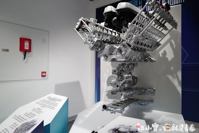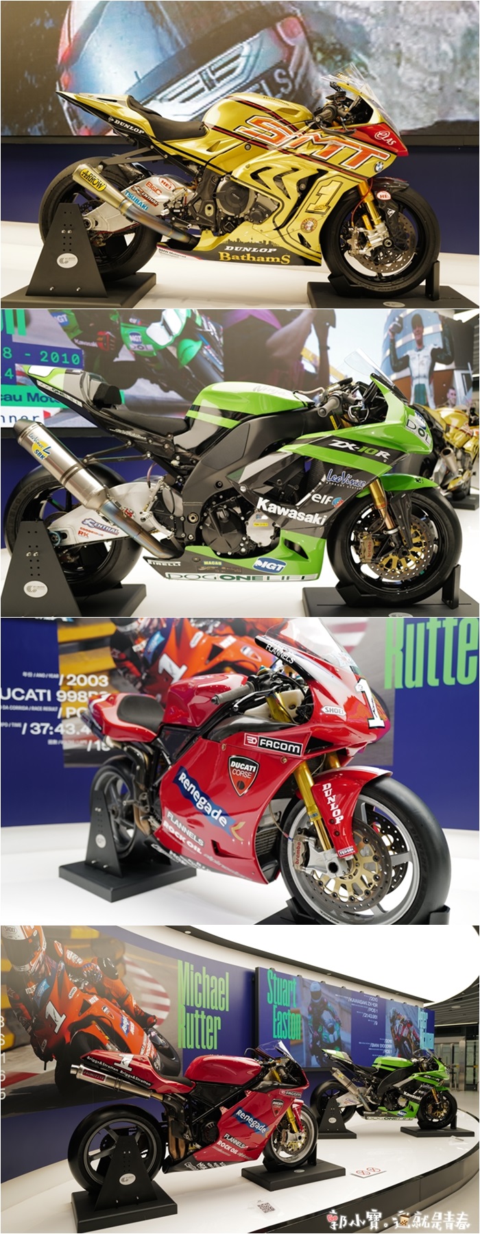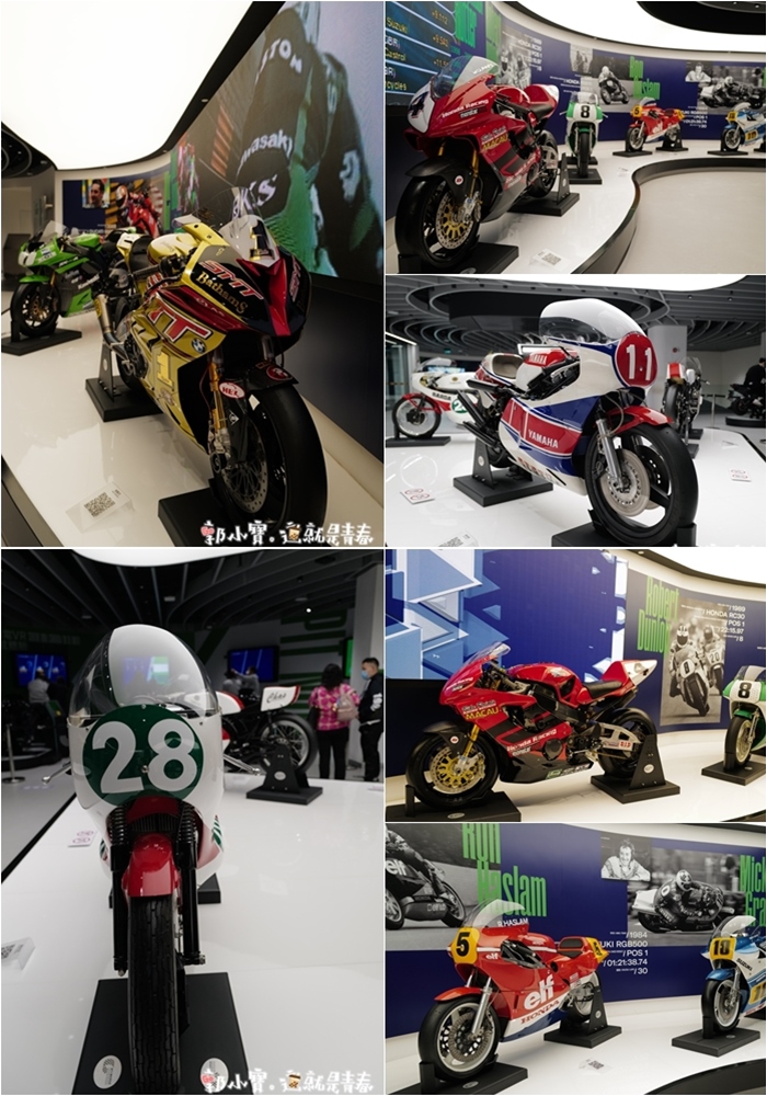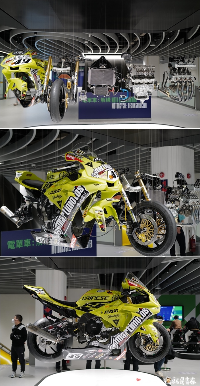 | 二樓第一眼印入眼簾的就是被分解的GP大賽等級的重型機車,從側面看是一整台完整的重機,但是從正面看就是被分解的重機,這樣的視覺呈現非常的讓人賞心悅目又不得不佩服館藏的用心。 |