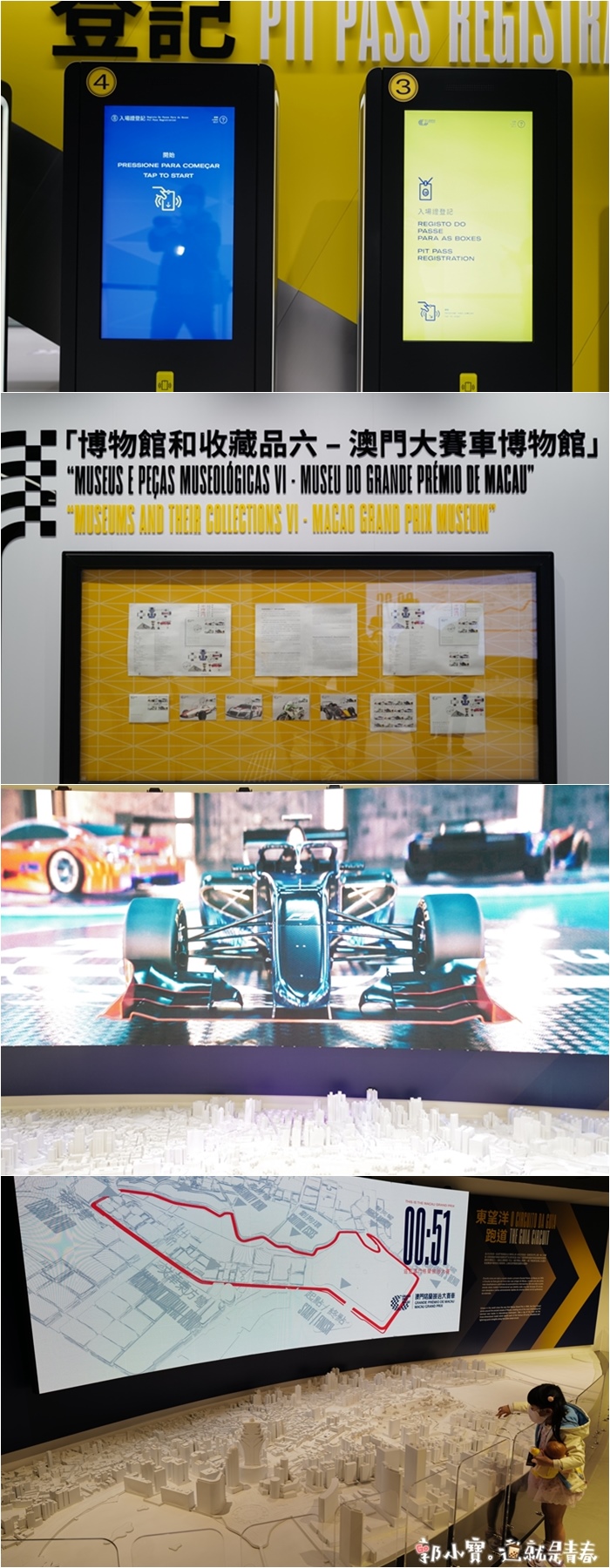 | 入口直接感應你的門票卡即可進入相當方便,一路上引導的人緣也非常多,這館藏也非常豐富,完整的紀錄澳門的賽車歷史,入口處也有整個澳門東望洋跑道的模型,整個模型非常精細,遊客可以彷彿從澳門高處觀看,總長度3.8英里的東望洋跑道,地勢曲折起伏,彎道多路也較窄,還有最出名的髮夾彎,寬度只有6.9米,是整條賽道最窄地方,完整的標誌出賽車路線。 |