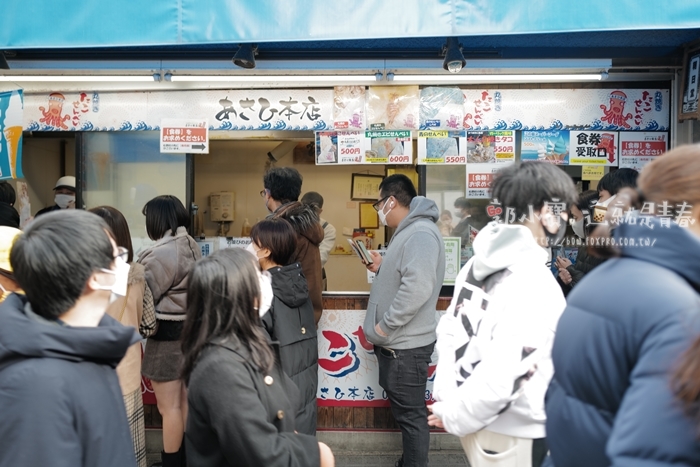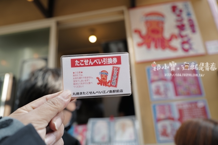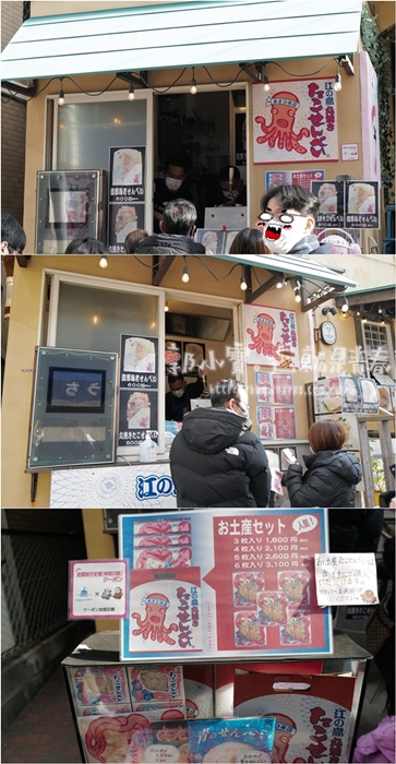 | 首創的老店似乎是江島上面的朝日堂,但是我覺得這海鮮仙貝基本上沒有什麼技術性,所以未到應該都差不多,在江島車站前往江島的商店街上就有一家江島丸燒也是製作海鮮仙貝的店家,看起來排隊的隊伍沒有特別長,就決定在這邊入手,朝日糖可能就要排很久很久! |