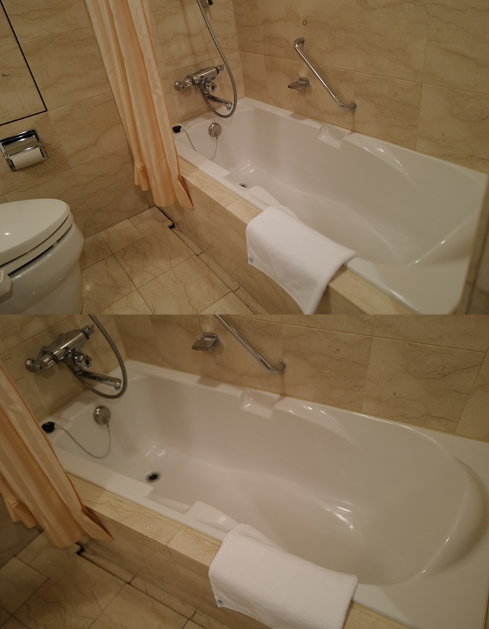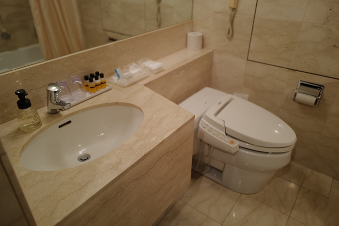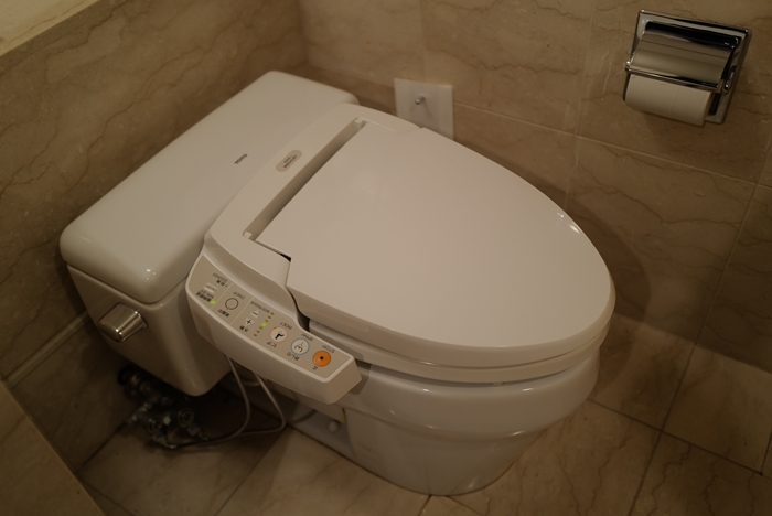 | 浴廁非一體式浴廁,現在日本大部分的商旅跟旅館很多都是使用一體成形的廁所,門司港普樂美雅飯店則是早期水泥搭配磁磚打造的廁所。 |