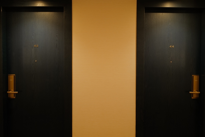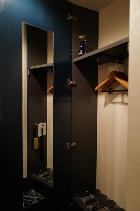 | 打開房門後進入到玄關通道,門後方就是吊掛式衣架,全身鏡則是鑲崁在門後。,玄關通道頗為寬敞。 |