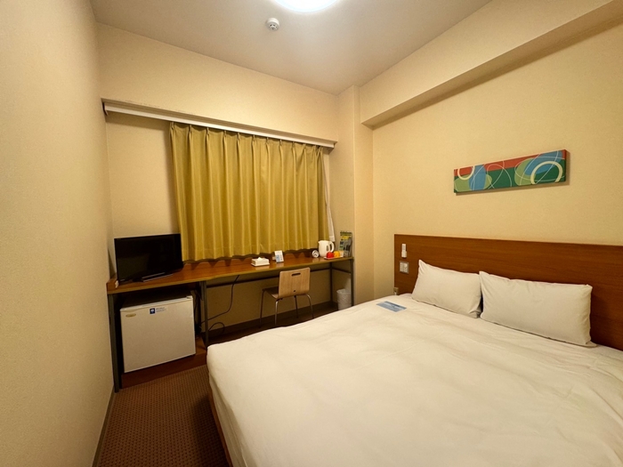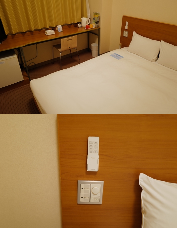| 房間內有獨立空調,長形桌板放置大多的電器,床鋪則是標準雙人床。 |