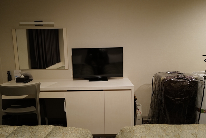 | 床鋪的對面就是辦公室桌跟電視櫃,電視小小的一台,但是電視我們幾乎都沒有看,化妝鏡也滿大的,但是我個人最重視的還是桌面,因為我每天都要使用筆電工作,所以有桌子我個人就有60分。 |