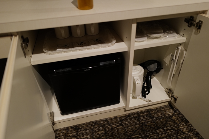 | 桌子底下就有小冰箱,電熱水壺跟茶包、啤酒杯等等器具。 |
