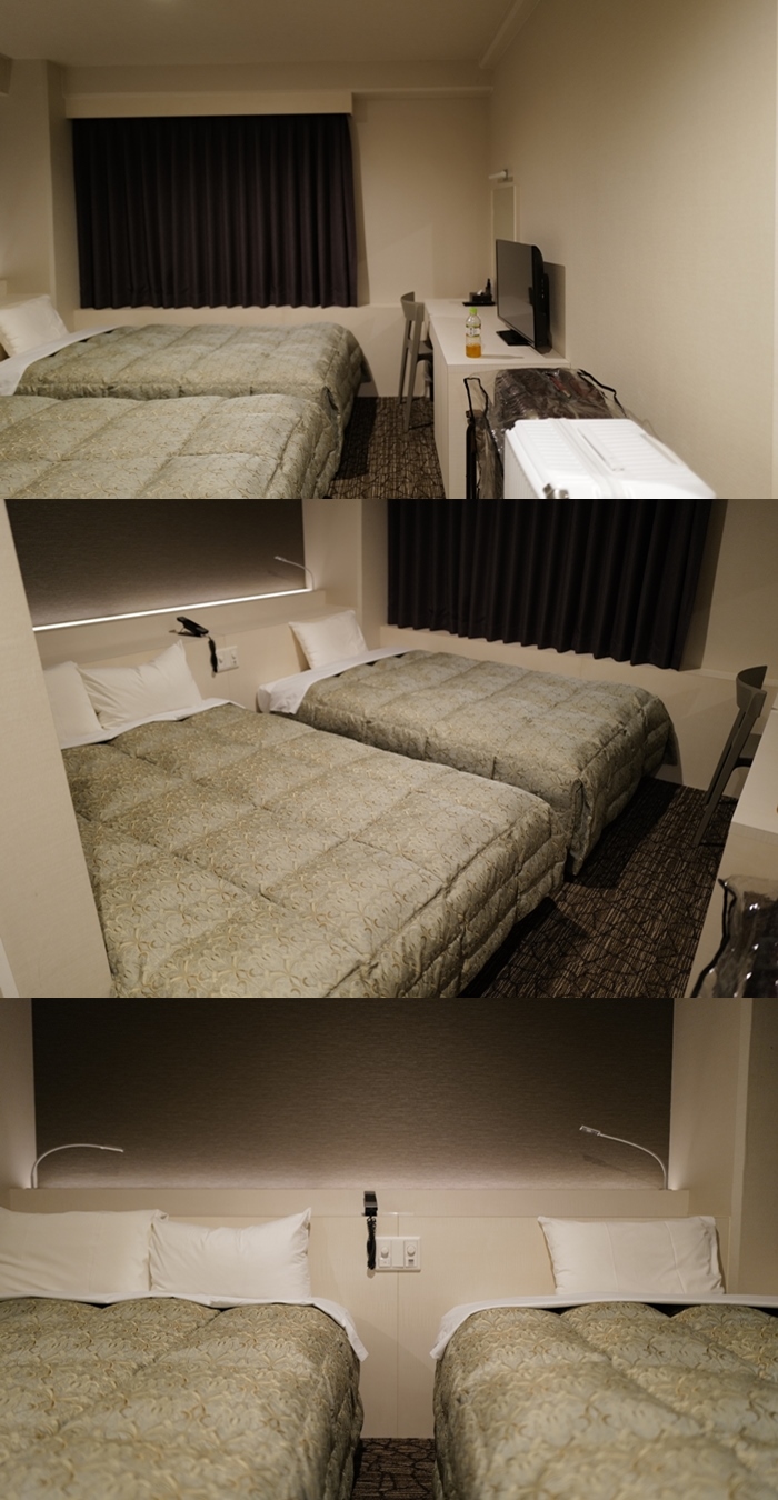 | 床墊也很好睡,棉被也是舒服的羽絨被,三人房沒有看到床頭櫃,兩張床的中間則是有USB充電孔,床頭上有閱讀燈。 |
