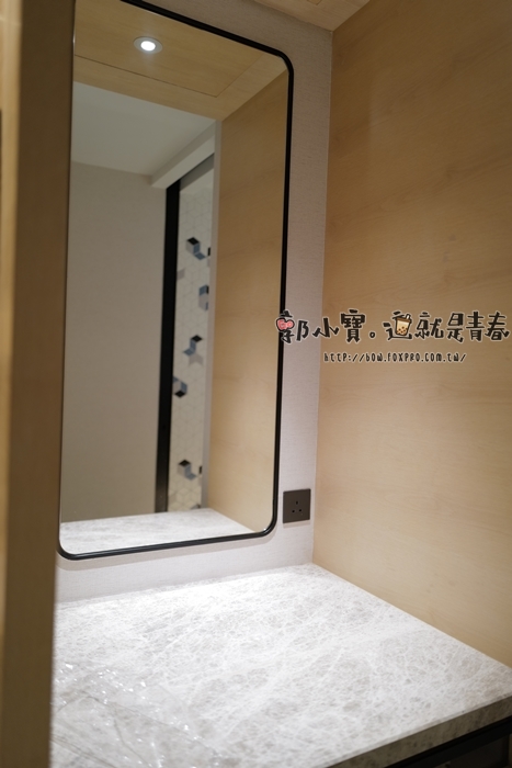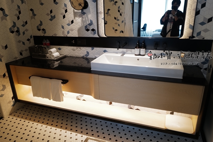 | 洗潄台是長型洗潄台,可以放置許多隨身物品,尤其是女性朋友的保養品跟化妝品還有隱形眼鏡等琳瑯滿目,有這樣的長型檯面就很方便,毛巾跟浴巾則是放置在檯面下方。 |