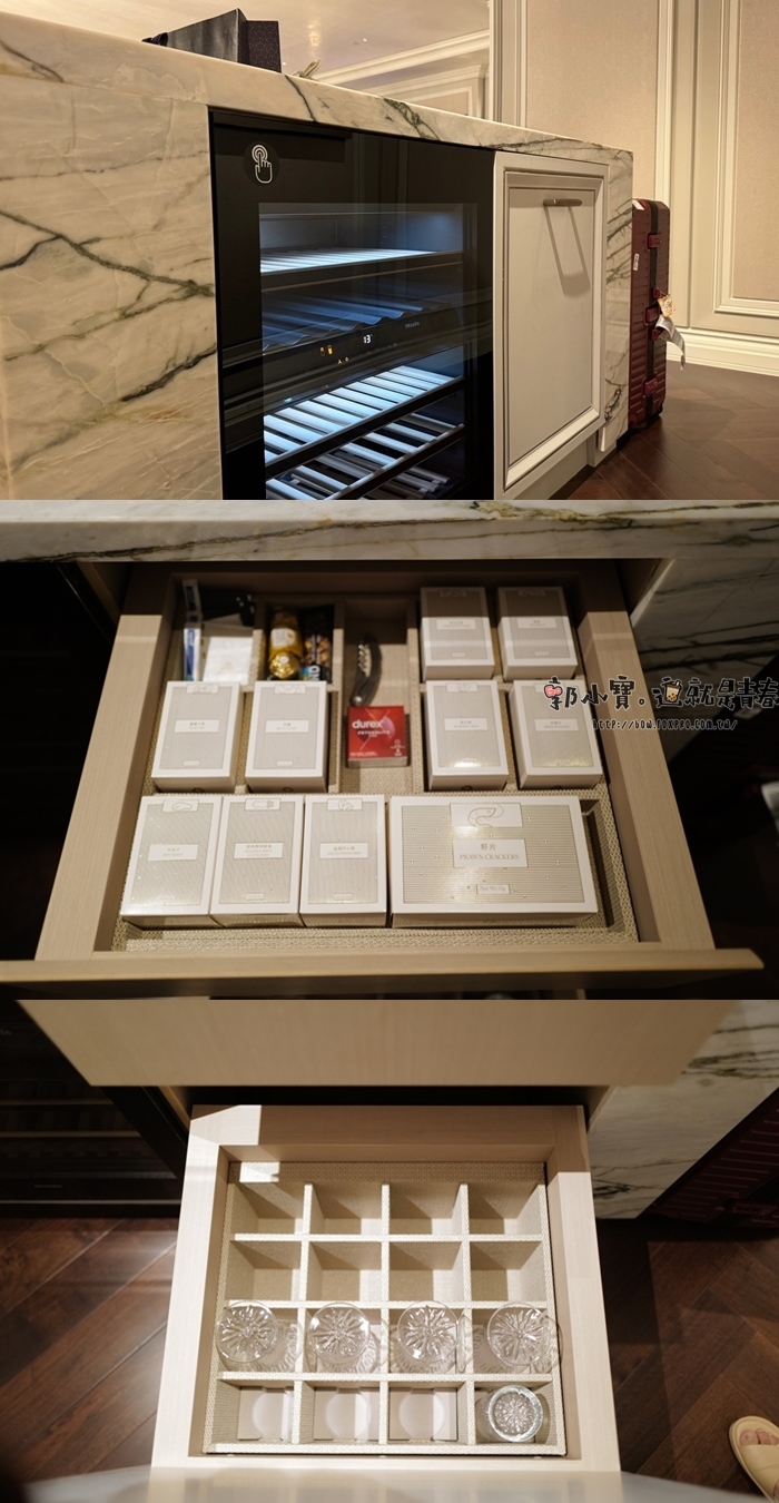 | 中島桌後方是紅酒櫃,因為一開始就跟KING 9 京匯說我們不會喝酒,所以就沒有事先準備紅酒,但是抽屜的零食真的有夠多的,且打開後都是大品牌的這種零食果乾巧克力,一整個超豪氣! |