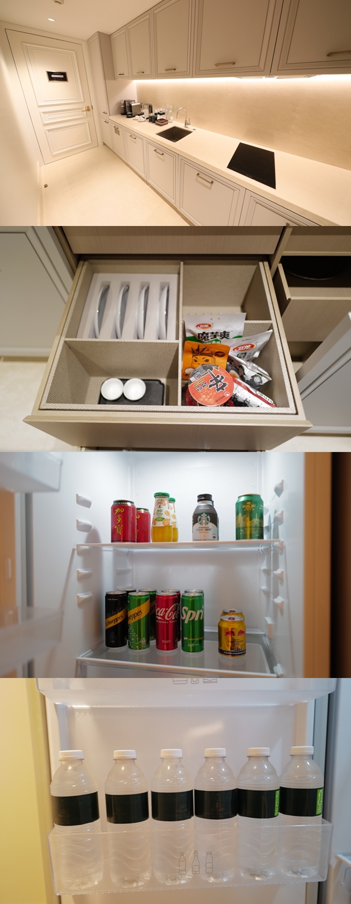 | 沒想到中島桌旁邊還有一個廚房,真的真的有夠誇張,大到像一間迷宮,廚房內的抽屜有超多零食,不管是超夯的魔芋爽還是泡麵、辣條、餅乾應有盡有,冰箱的飲料也都是可以直接飲用的,除了星巴克飲料還有啤酒可樂、王老吉、柳橙汁等等通通應有盡有! |