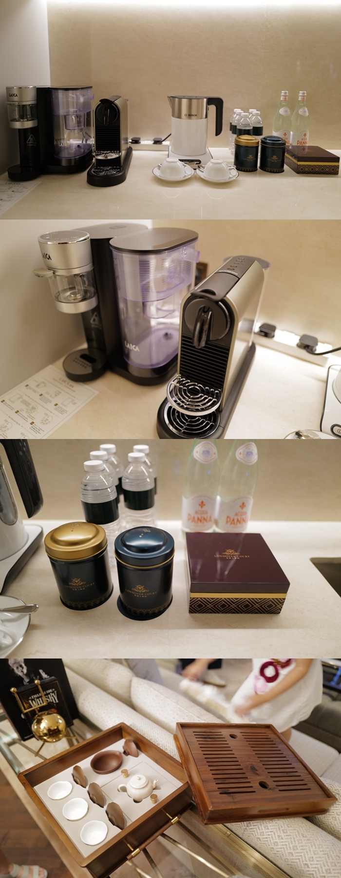 | 除了基本的膠囊咖啡跟電熱水壺以外,還有第一次看到酒店也有提供泡茶機,連裝茶葉的茶罐都超精美,且裡面的茶包是真空包裝的原片茶葉,直接放入泡茶機就可以沖出一杯好茶,可以請茶師來房間直接泡給貴賓喝。 |