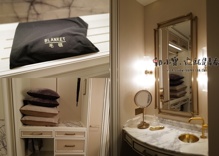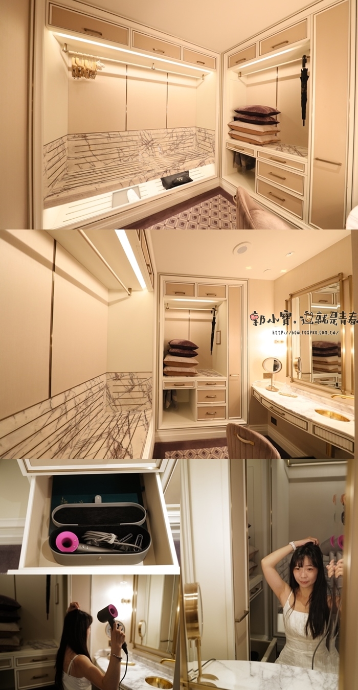 | 衣物間也是很誇張,根本就是每個女孩子夢想的更衣間,行李架大到可以放兩個以上的行李箱,上方就可以直接吊掛衣物,化妝台有獨立燈光,抽屜裏面配備的是戴森的吹風機,配備真的都是最頂級的,尤其他們的拖鞋超級厚,比我自己家裏面買的一雙399元的拖鞋還會,毛茸茸的穿起來好舒服。 |
