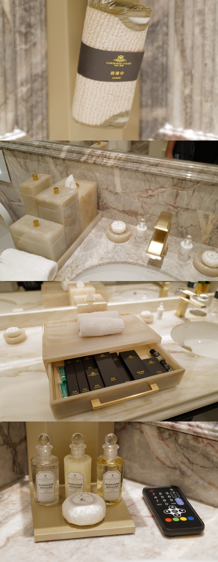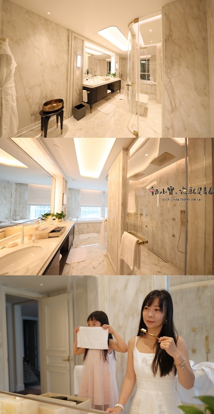 | 浴廁也是超大,標準的大雙人雙盆洗手檯面,一家三人站在台面前刷牙洗臉還綽綽有餘,連備品盒都是大理石盒,浴袍也很厚但是卻不會很重,穿起來特別舒服,入住一天讓我們驚奇連連,畢竟澳門大部分的酒店都住了,但是御園確實在任何細節上都做到很完美。 |