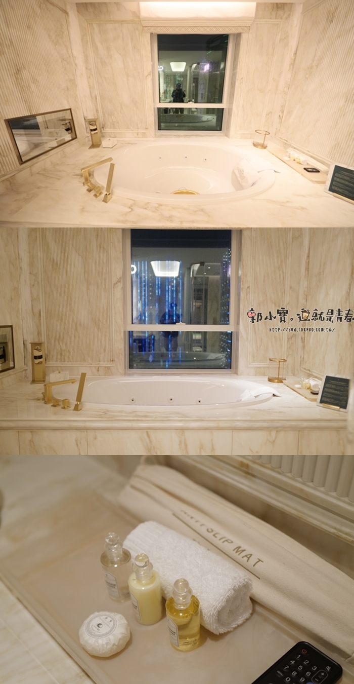 | 主臥室的浴缸是圓形按摩浴缸,配有電視銀幕可觀賞,窗外則是澳門的葉景,精油跟沐浴鹽用完可以在跟房務說,它們會在送來,或是開夜床的時候都會自動補上,浴沐用品也都用的不錯,好像也是跟擁有私人管家的瑞吉酒店用的一樣。 |