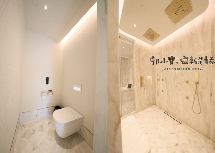 | 最誇張的是連淋浴間也是雙人淋浴間,兩個蓮蓬頭兩個頂上花灑,這雙人淋浴間是我第一次看到,根本就是鴛鴦浴被備的空間阿,淋浴間內還有大理石椅可以休息,搭配的五金件都是金色,有夠豪華! |