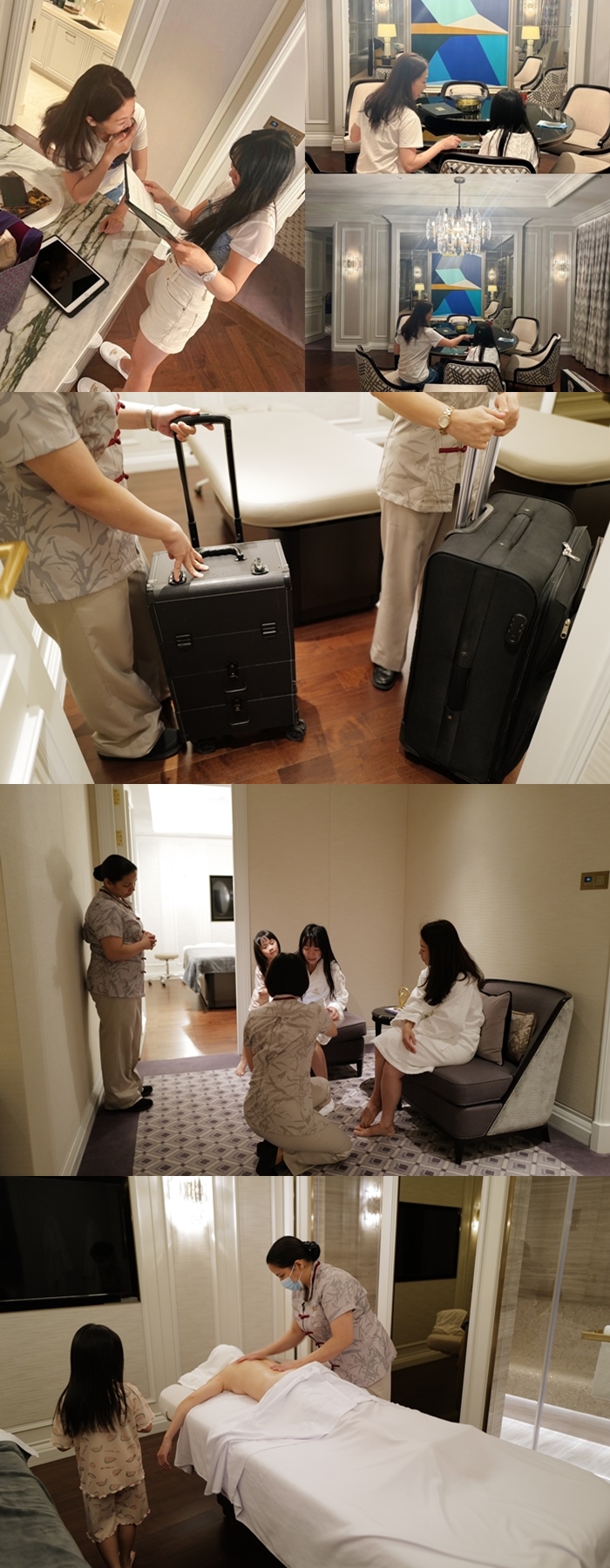 | 兩個女生就馬上去翻SPA目錄,挑選了全身SPA安排好時間後,就在飯廳點了消夜吃了起來,等待精油師的到來,兩位芳療師到達房間後,先跟貴賓討論好精油的種類,還有課程,然後就直接在房間享受起來,在房間做SPA最大的優勢就是,孩子讓她在我們自己的客廳看電視或是隨時可以找到家長最安心。 |