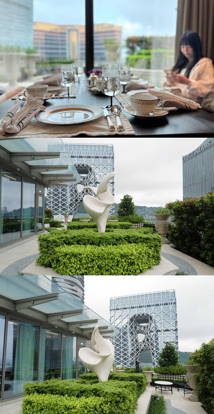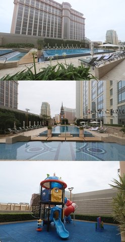 | 這裡還有室外空間,景色其實也很漂亮,但是夏天的澳門真的有點熱,所以大部分的人都是躲在室內,不過是內野都是大落地窗,依然可以欣賞到外面的景色,還可以看到永利皇宮的水舞呢! |