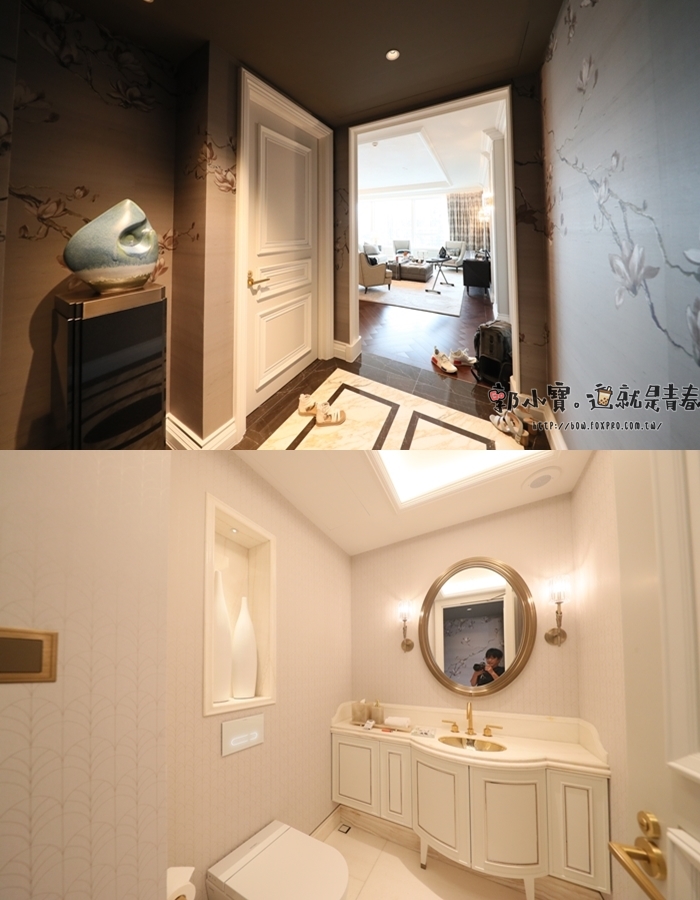 | 一打開房門就是超大的玄關,玄關左手邊就有一間客用廁所,客用廁所超級大,大到比一搬酒店的套房廁所還大。 |
