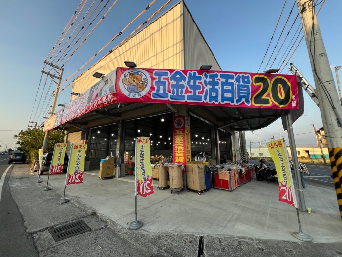 店外高掛著紅色帆布,百貨五金通通20元起出清,金樂熊五金百貨攏總俗呼你。 |