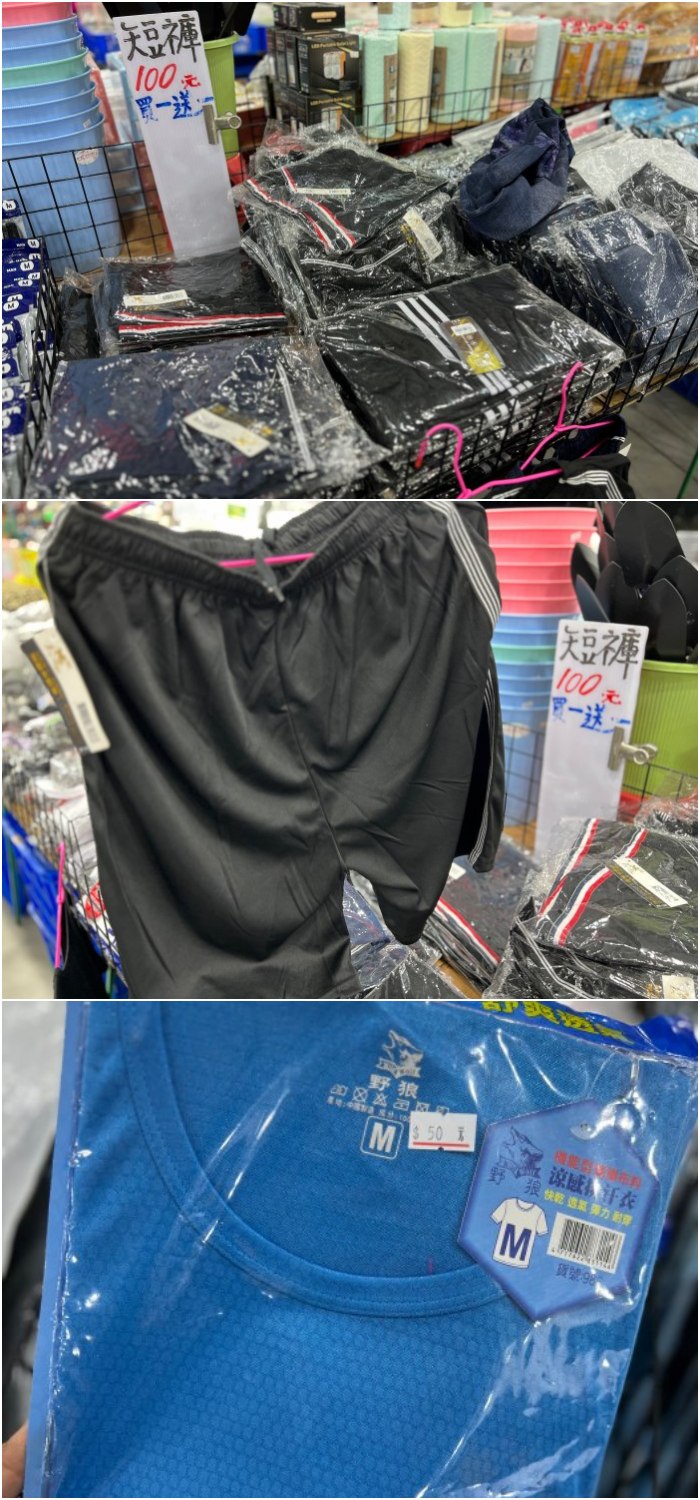 | 夏季短褲買一送一只要100元,等於1件只要50元,相當划算,還有很多透氣涼感的上衣可以挑選,也只要50元起。 |