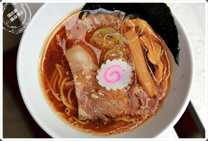 | 這就是老闆煮好的拉麵端給我們的樣子,是以醬油湯頭為主,因為一碗拉麵只有500円,所以全部的碗都是統一的,麵碗其實沒有很大碗,比一般的拉麵小很多,麵量也較少,叉燒也小小的一片XD |