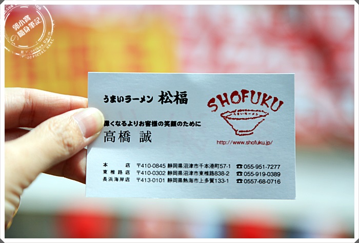 | 老闆還特別給了我他的名片,真的是太可愛了,後面還用中文寫了謝謝,我也超感謝可以親自吃到年輕老闆的拉麵,真的很推薦的拉麵店,我在日本吃過的拉麵店至少有500家,松福真的算是在前20名了。 |